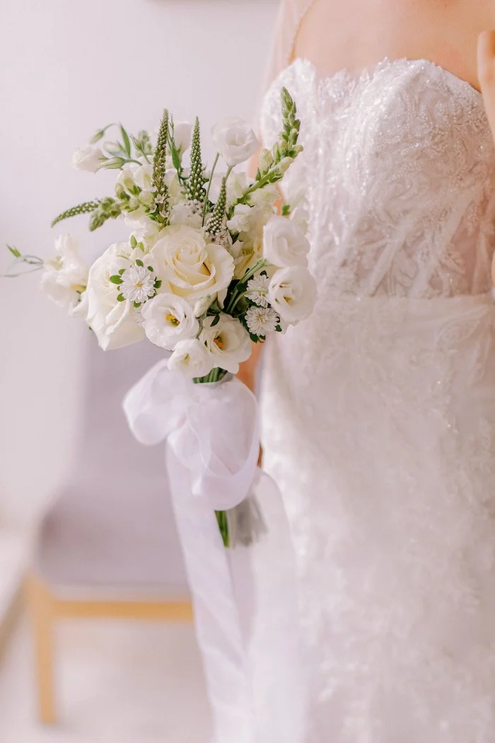 The design focused on a soft, timeless palette of whites and fresh greenery, with delicate roses, lisianthus, and seasonal blooms.