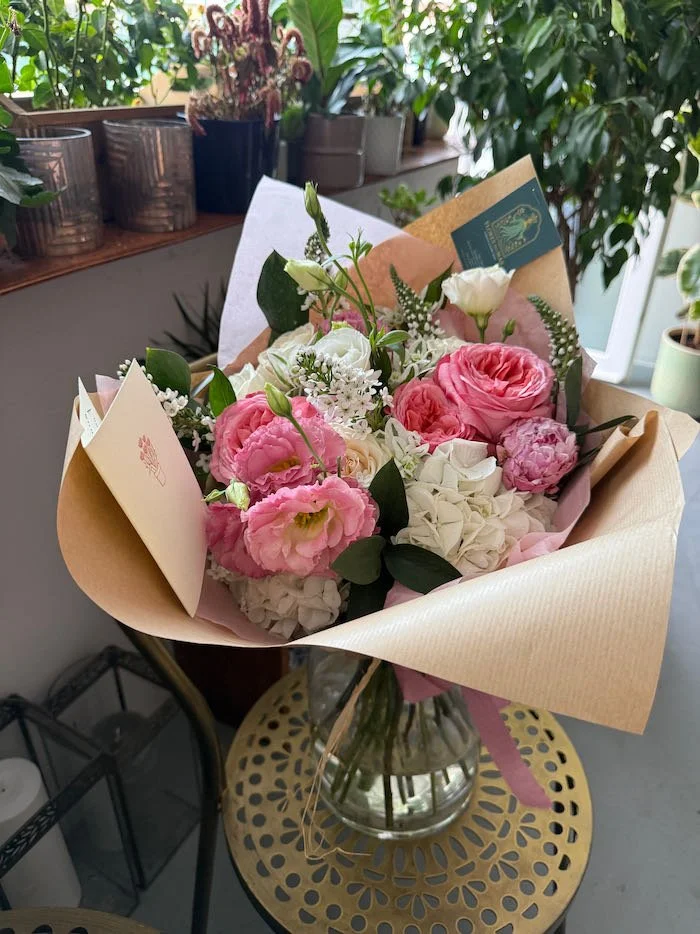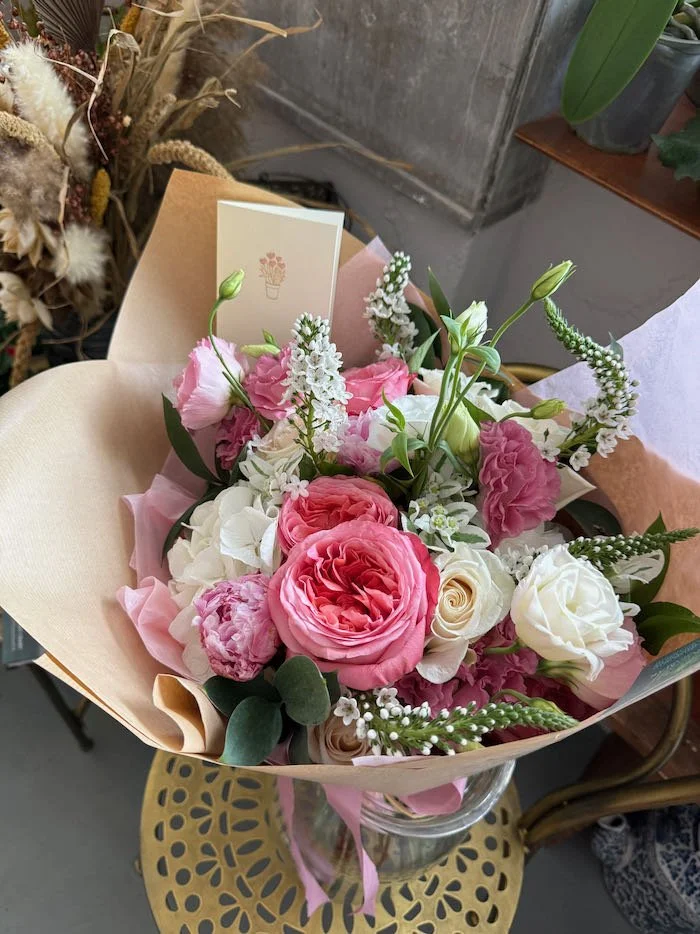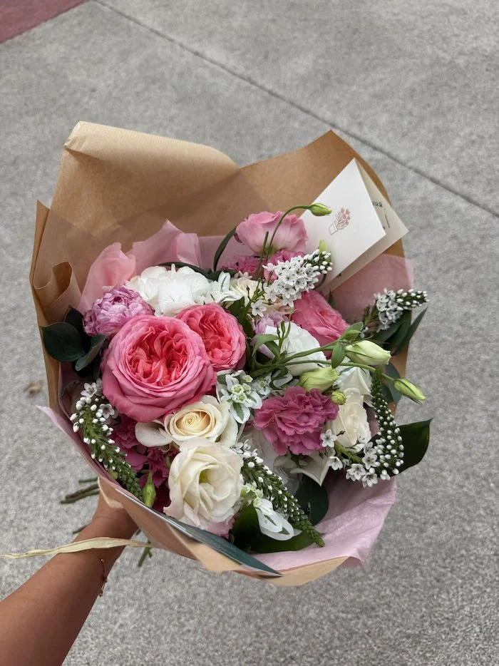 ORDER ONLINE › "The Crush" - Pink & White Mix Hand Tied Bouquet ( Shown: Medium €75) *customer favourite Image 1 of 3 Image 2 of 3 Image 3 of 3 "The Crush" - Pink & White Mix Hand Tied Bouquet ( Shown: Medium €75) *customer favourite from €50.00 Soft, romantic tones of pink, ivory, white and cream — an elegant all-occasion bouquet that suits any occasion. Size: Select Size €50 - small - (30-35cm) - a thoughtful gift, perfect for any occasion €75- medium - (40-45cm) - our most popular size, full and romantic €125- large - (50-55cm) - a luxurious bouquet for special moments custom design (€175+- bespoke or x large message us on WhatsApp Quantity: Add To Cart Added! Soft, romantic tones of pink, ivory, white and cream — an elegant all-occasion bouquet that suits any occasion.