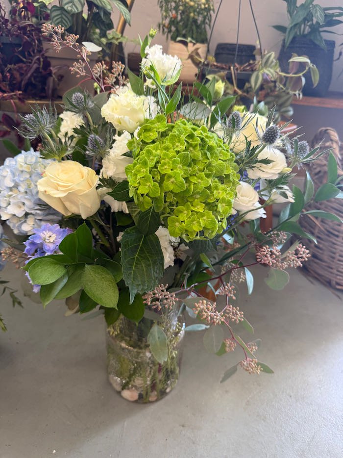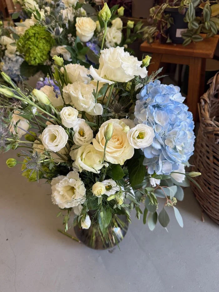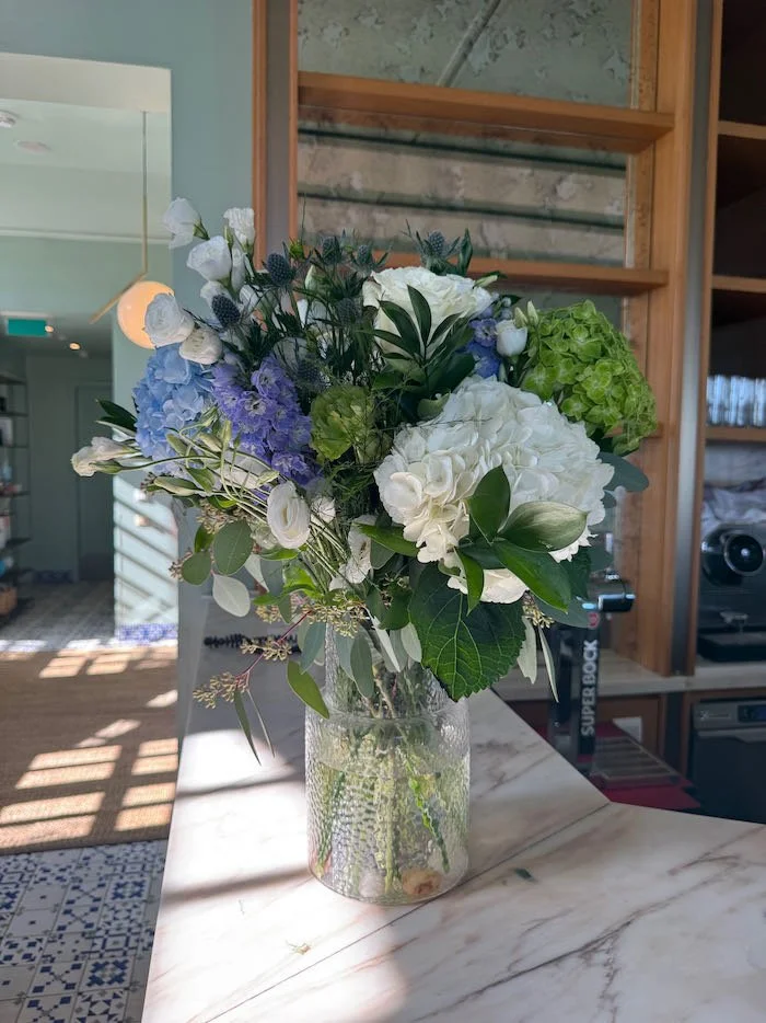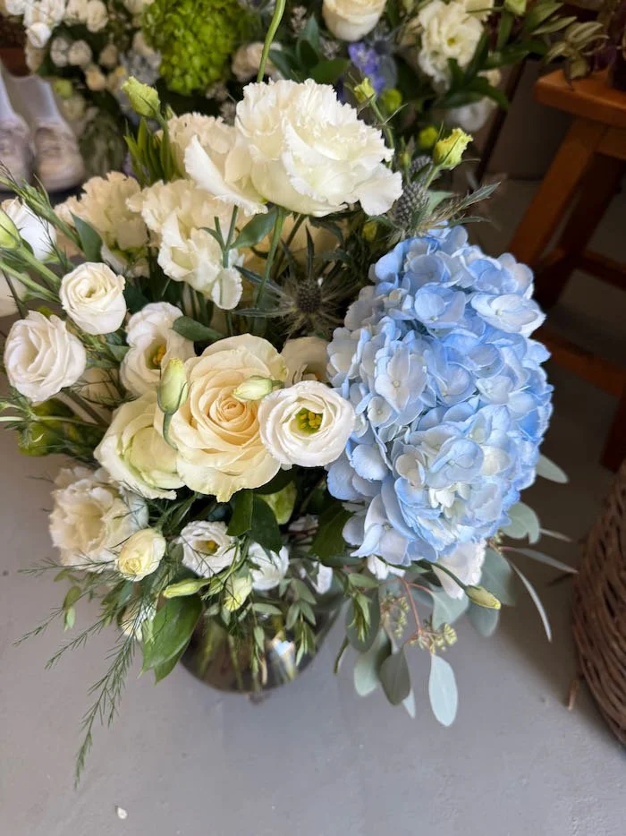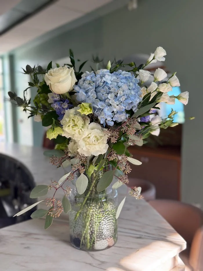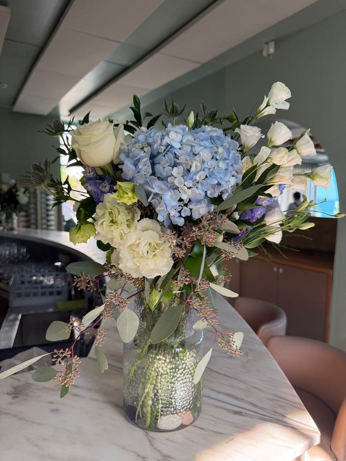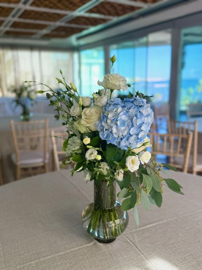 We worked with a delicate combination of blue and white hydrangeas, roses, lisianthus, and fresh greenery to create arrangements that reflected the shimmer and depth of the ocean.