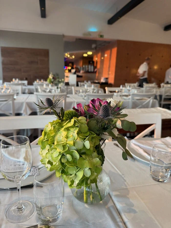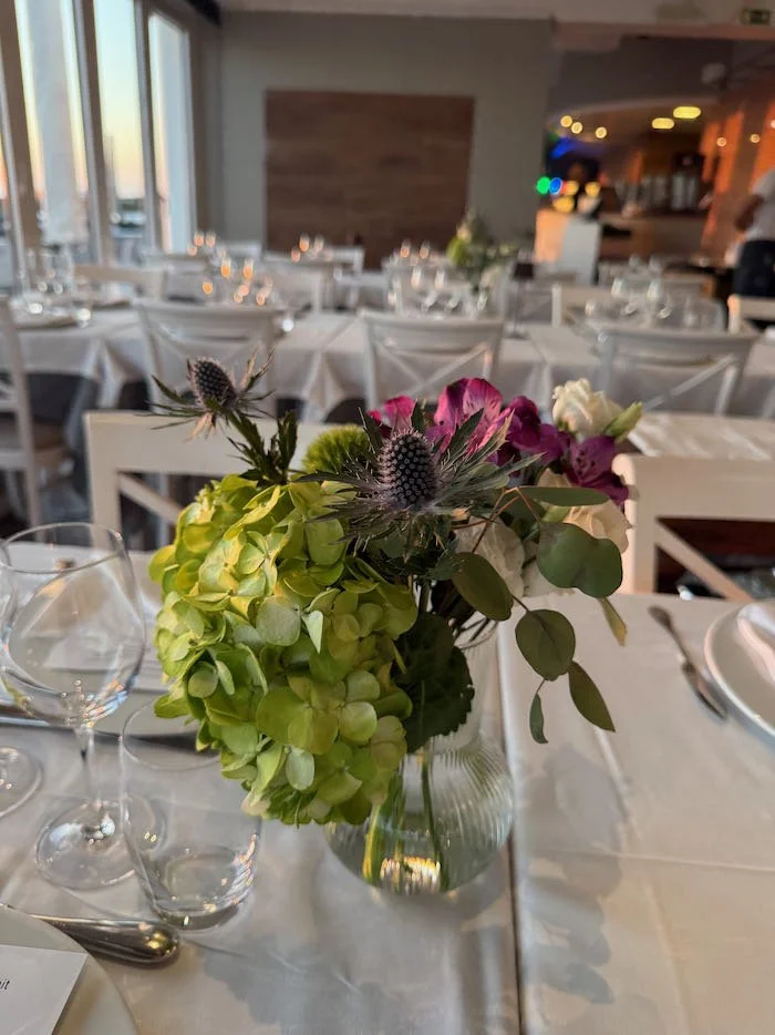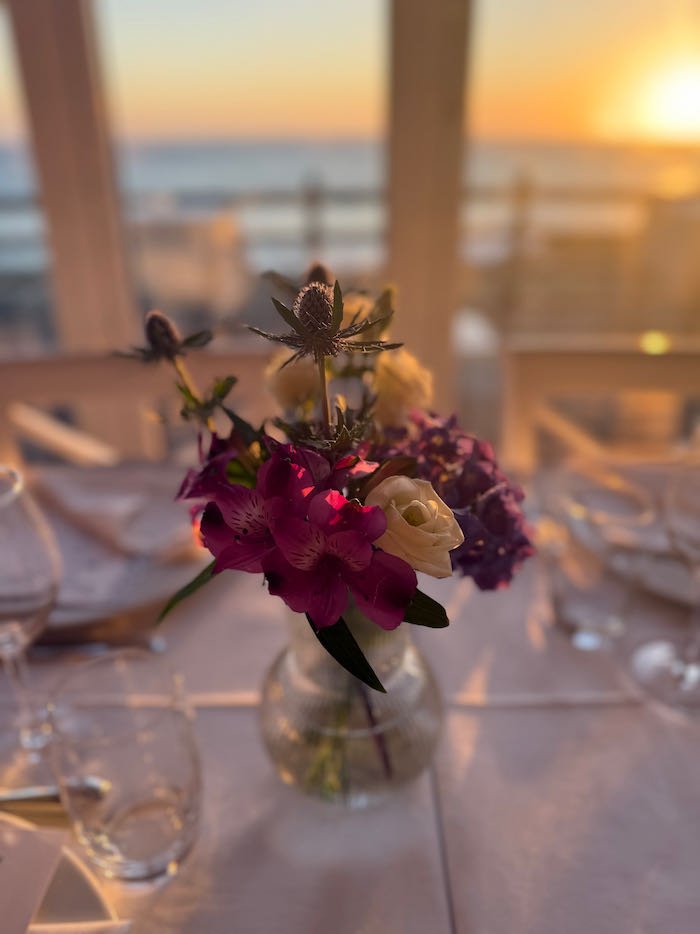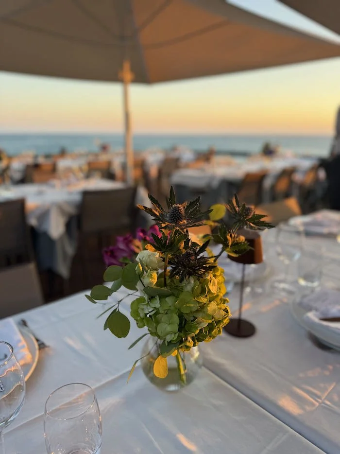 The following evening, the celebration continued at Montmartre Restaurant, where we created a sit-down dinner setup for 150 guests. The tables were adorned with lush floral runners and clusters of bud vases, adding warmth and refinement to the modern seaside setting.