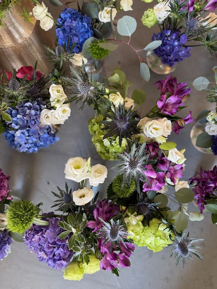 For the cocktail reception at the Villa Itália Hotel, we designed table arrangements and decor elements featuring hydrangeas, roses, delphinium, and seasonal foliage — fresh, sophisticated, and perfectly coastal.