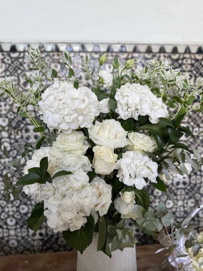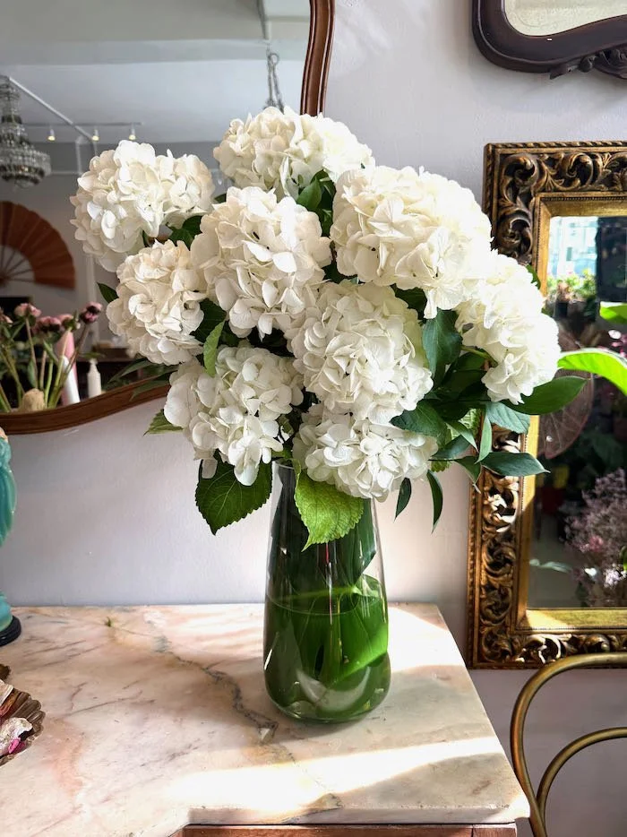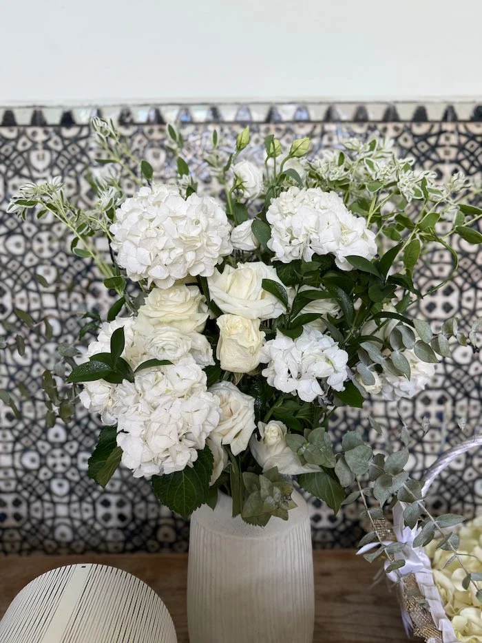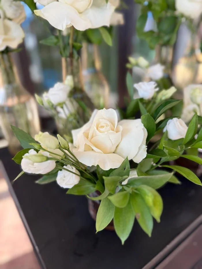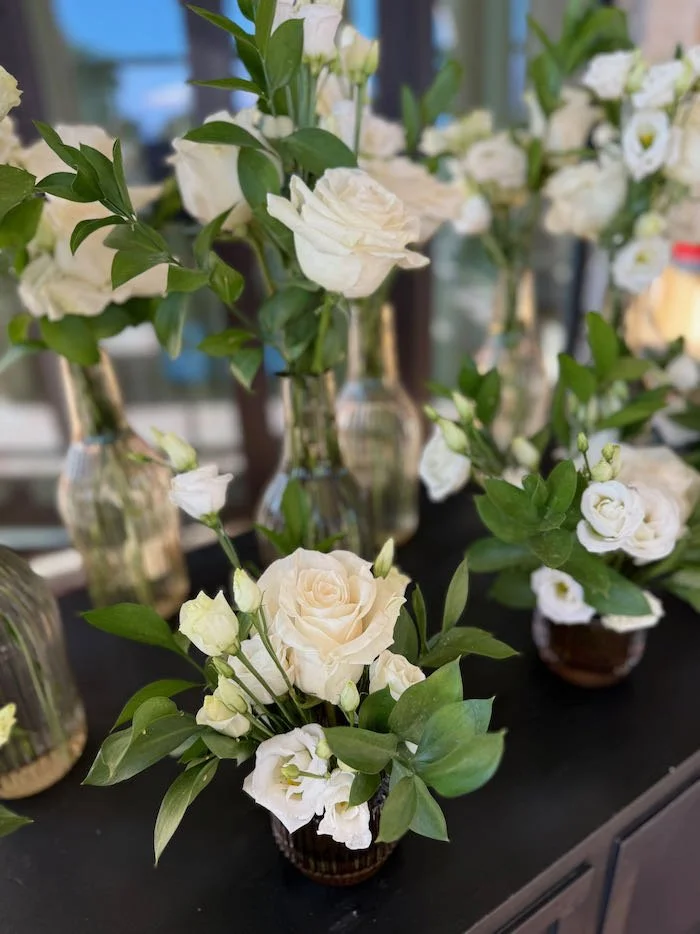 We styled the high tables with delicate white hydrangeas, roses, and lush greenery, arranged in simple glass vases to create an airy and refined look.